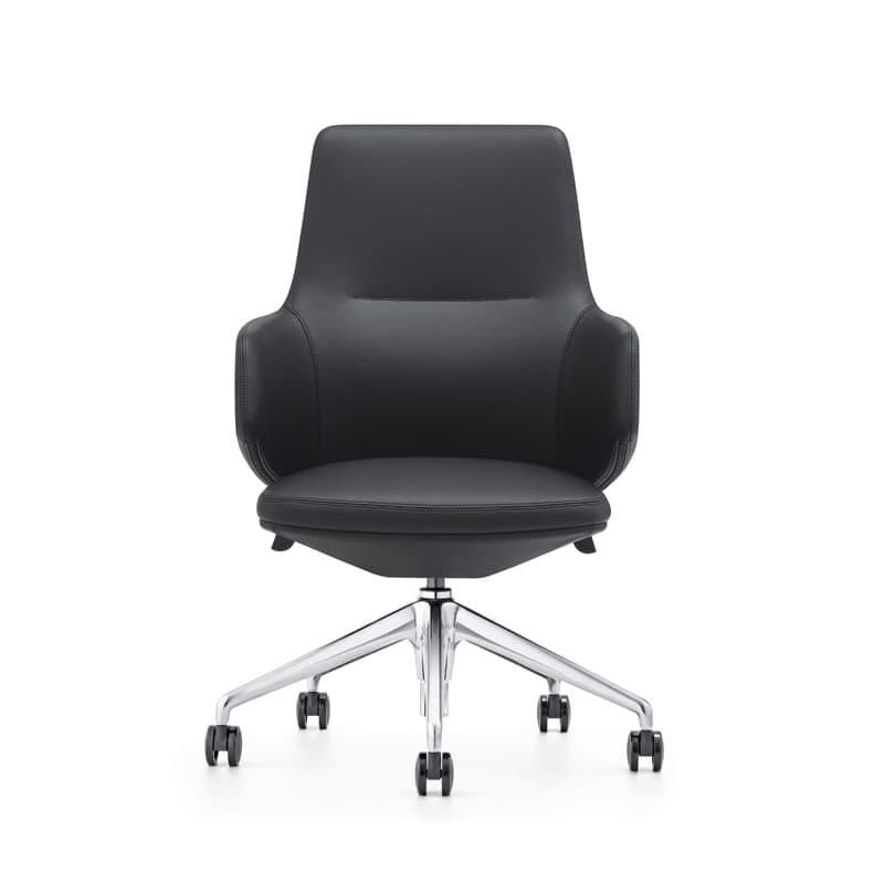 احصل على كرسي قاعة اجتماعات عالي الجودة بظهر وسط ومقعد من الجلد الصناعي الاسود الأنيق، مع مساند يد ثابتة وقاعدة خماسية متينة من الألومنيوم مزودة بعجلات PU لسهولة الحركة والثبات.