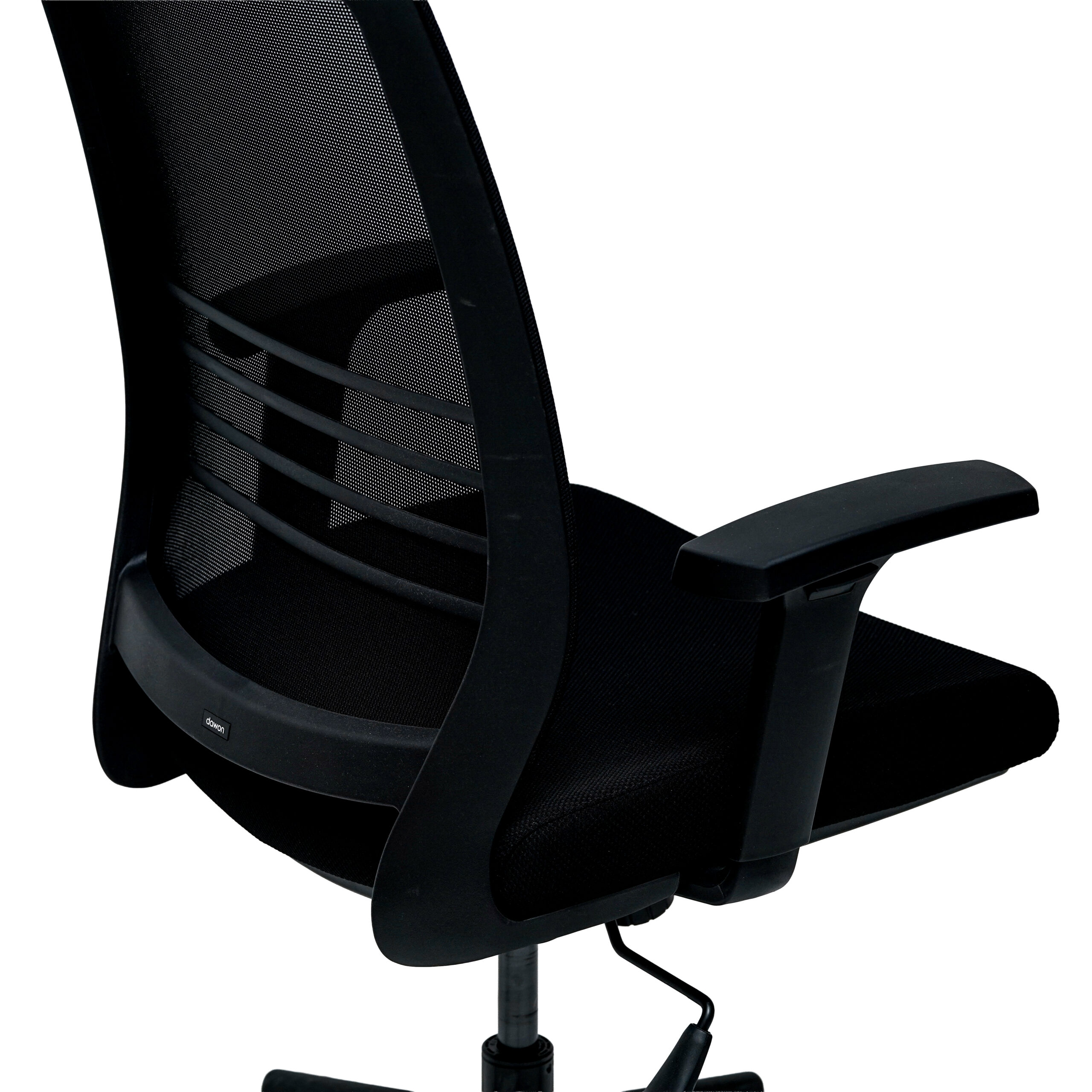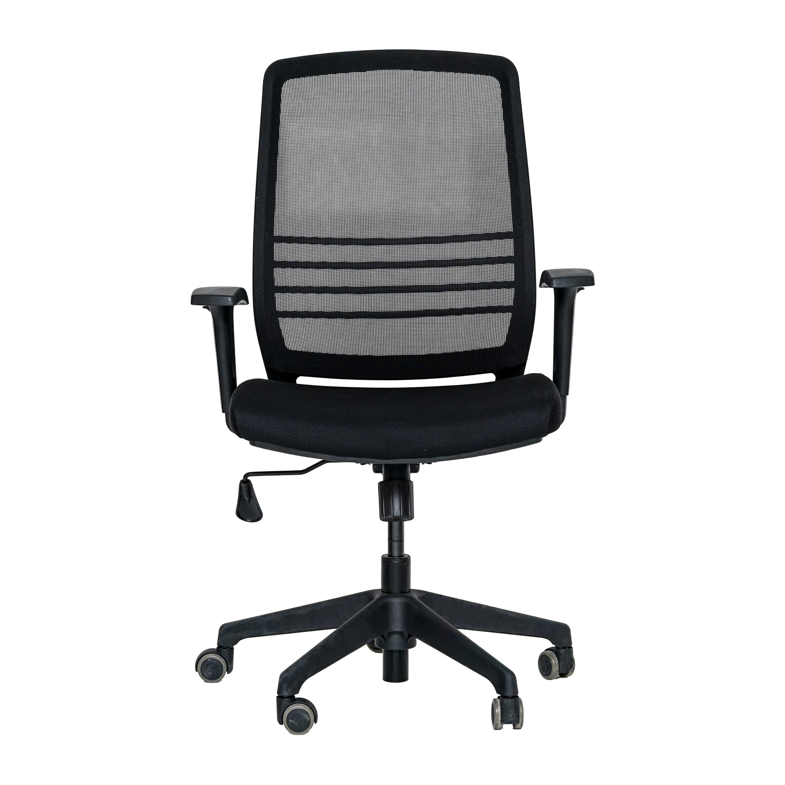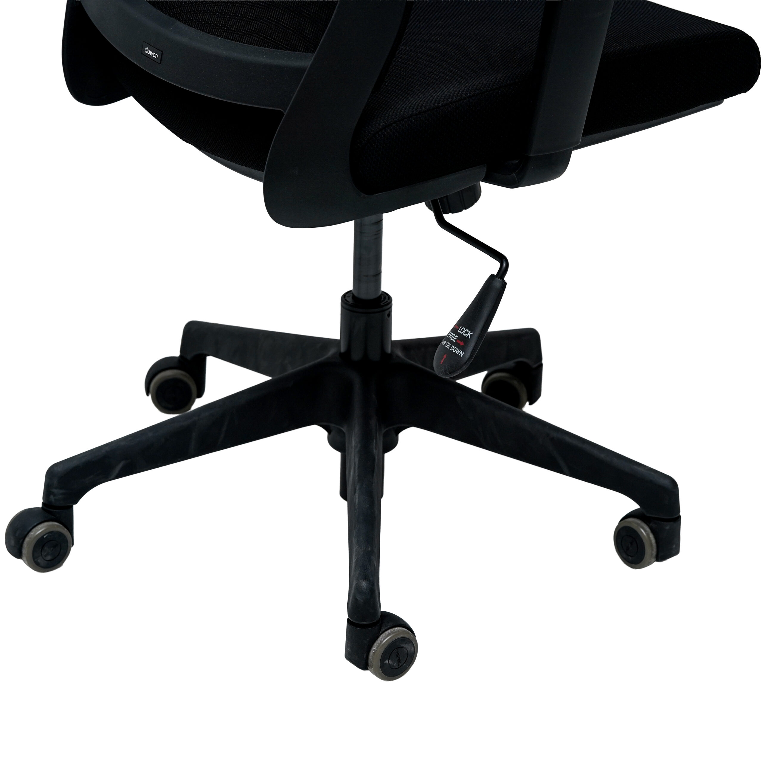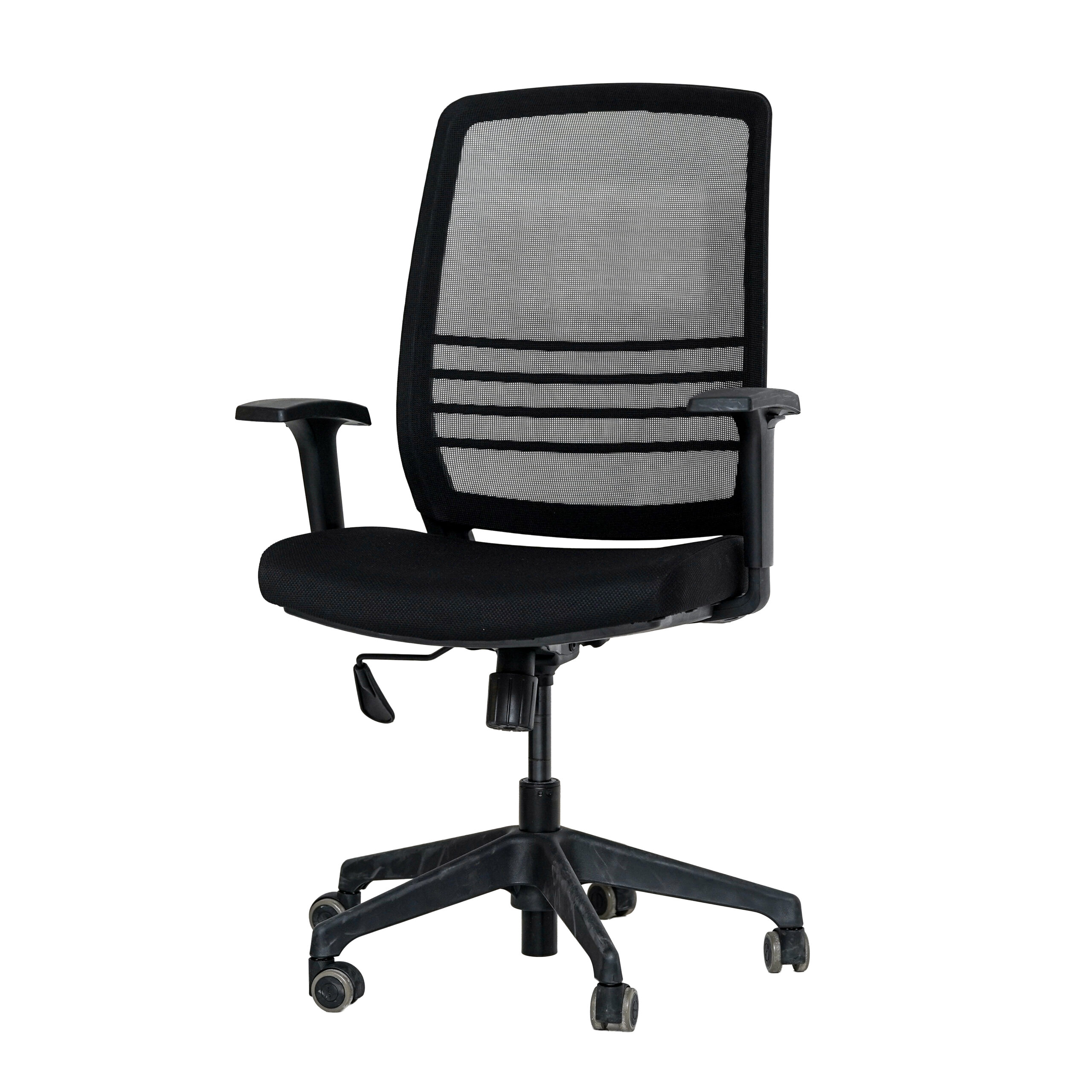 كرسي دوّار بظهر شبكي يوفر تهوية جيدة وراحة أثناء الجلوس لفترات طويلة. المقعد مبطن بتنجيد مريح، مع مساند ذراعين ثابتة تمنح دعماً إضافياً. مزود بقاعدة معدنية قوية بخمس عجلات لسهولة الحركة. |